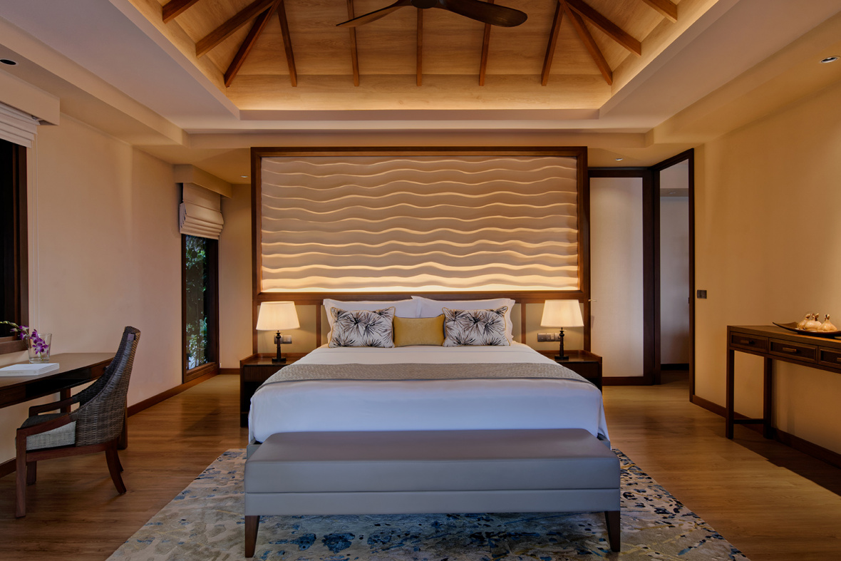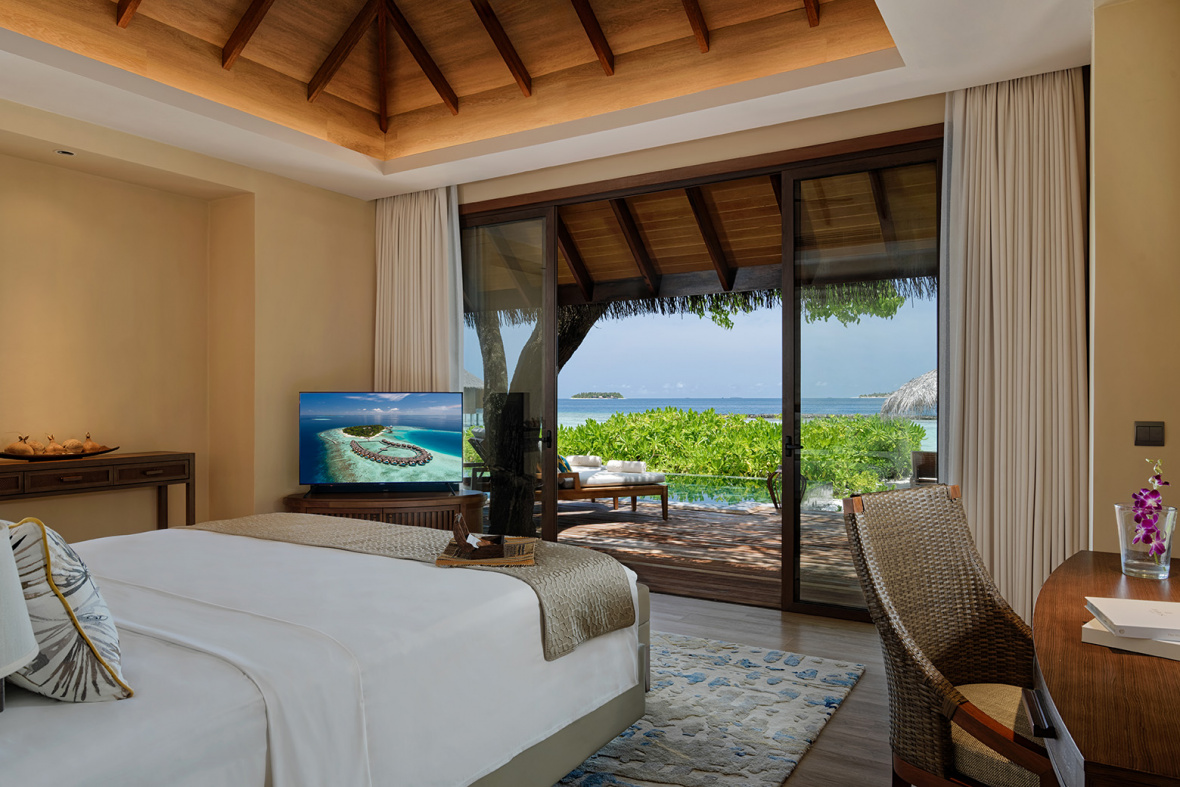 Дизайн виллы гармонично сочетает максимальный комфорт с традиционной мальдивской архитектурой, благодаря элегантной мебели, высококлассным удобствам и деталям, которые отражают природную красоту окрестностей. Интерьеры решены в мягких природных тонах и украшены орнаментами, повторяющих текстуру дерева, коралловые рифы и рябь морской воды.